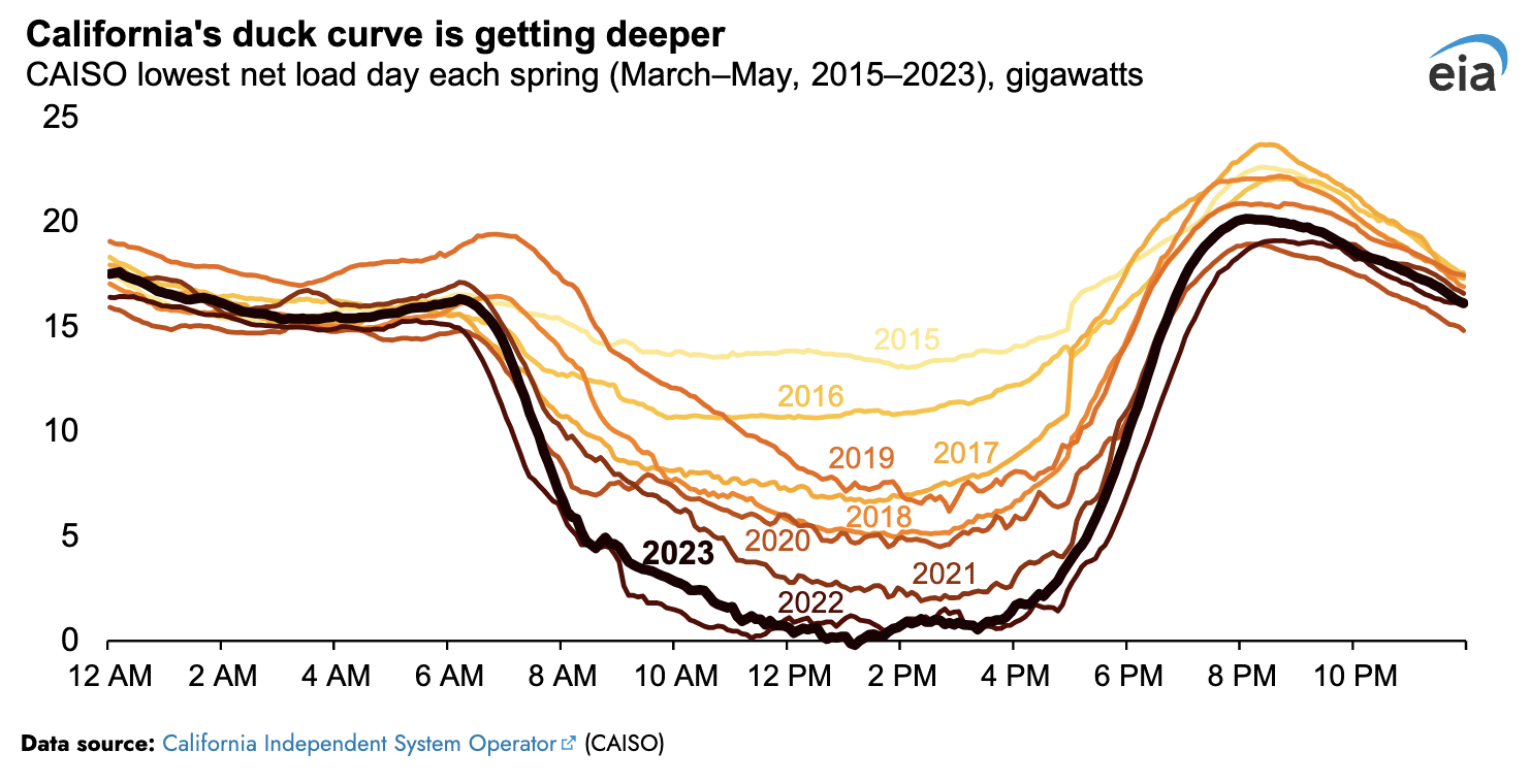 To demonstrate one problem with intermittency, consider Figure 4 that shows the electricity generation in California over a 24-hour period. The “duck curve” shows that solar electricity generation peaks in the middle of the day when the sun is shining. As the sun sets, solar electricity generation falls off, and other sources of electricity generation must be used to meet demand. This increase in demand is typically met by natural gas-fired power plants, which have have costly “ramping” costs. The duck curve also demonstrates a problem: if I wanted to build a solar plant, who would I sell my electricity to during the middle of the day? The high penetration of solar, combined with the lack of electricity storage, leads weakens the incentives to invest in more solar capacity.
