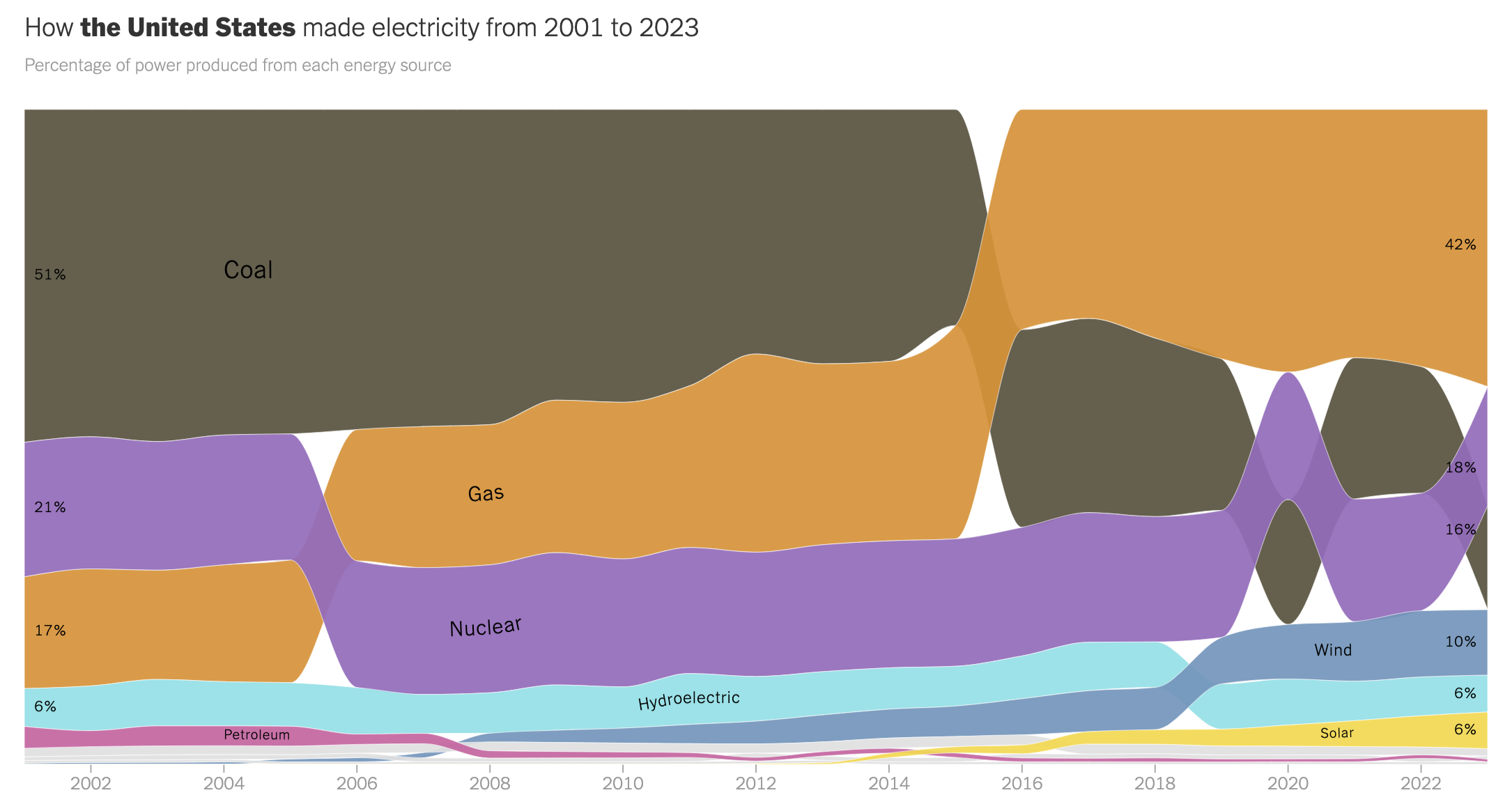 In the late 2000s through the 2010s, the share of electricity produced from natural gas increase considerably. This rise was due primarily to the abundance of natural gas from hydraulic fracturing (i.e., fracking). Fracking is a method of extracting natural gas from shale rock formations that were previously inaccessible.