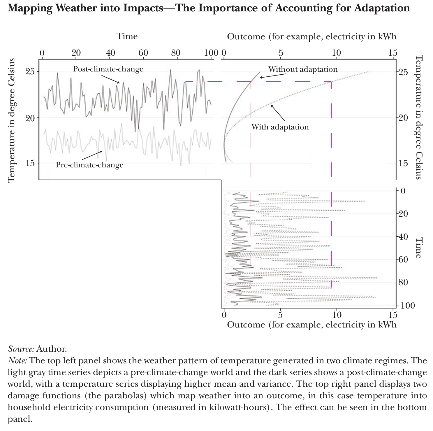 The challenge is understanding the degree to which the weather-response function will change in the future. With electricity use, we might expect that society will adapt to higher temperatures by using more air conditioning, which would change the shape of the weather-response function (as shown in the top right panel).
