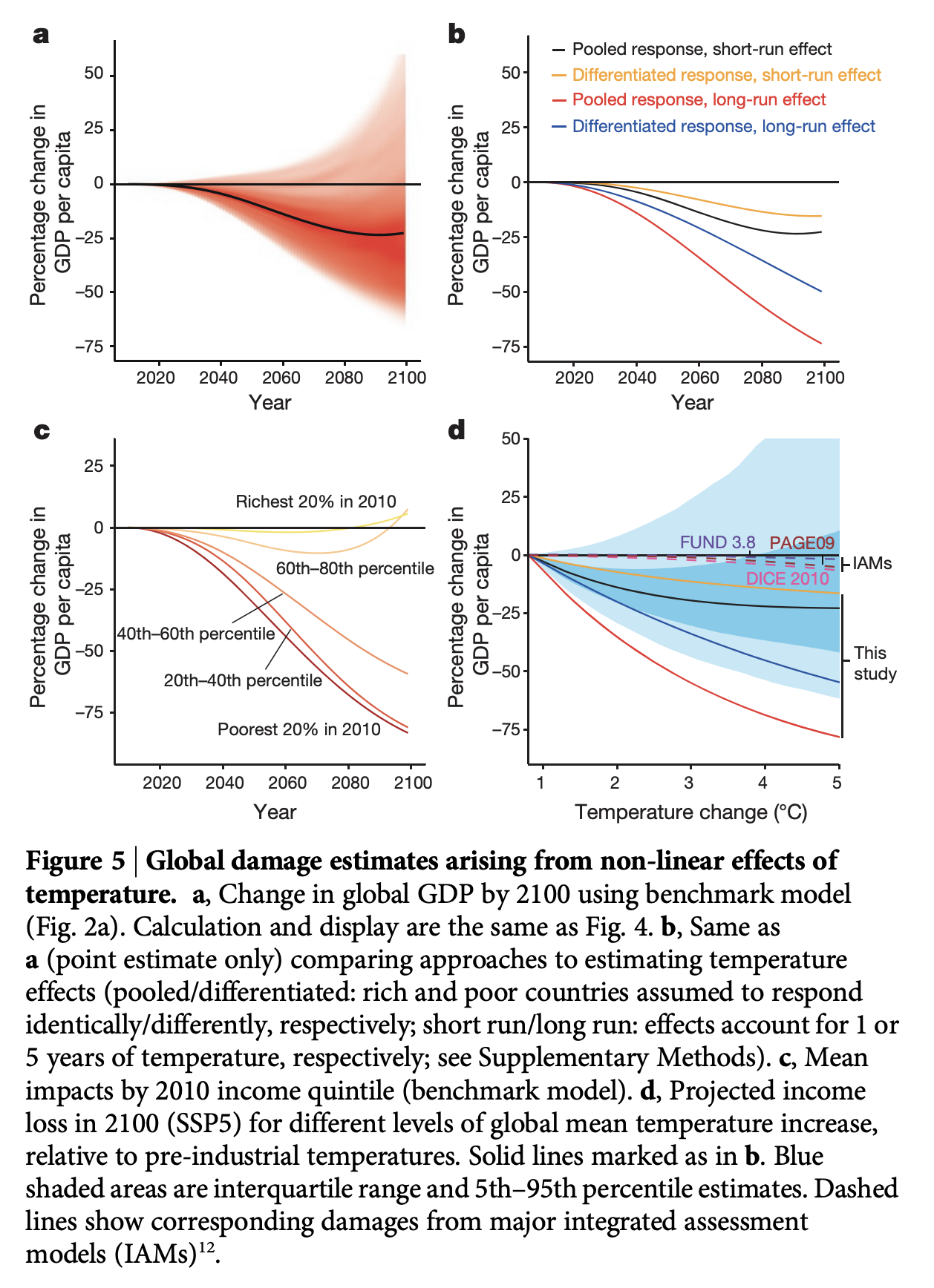 An example of a damage function is shown in Figure 2. This damage function is from Burke, Hsiang, and Miguel (2015) and shows the relationship between temperature and GDP per capita. The damage function is estimated using a regression model that relates temperature to GDP per capita. The figure compares the estimated damage function to previous estimates of climate damages from three influential IAMs (DICE, FUND, and Page). Depending on modeling assumptions, what’s included in the model, and so forth, the damage function can vary substantially across IAMs. Naturally, these choices can have a dramatic influence on the SCC.