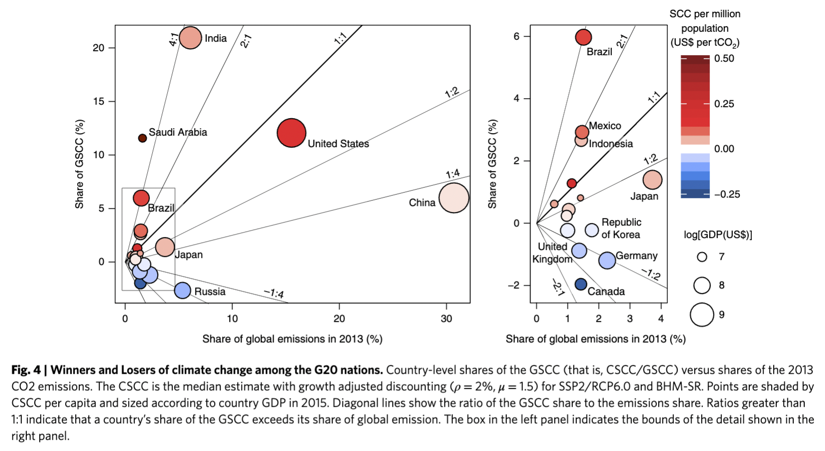 Figure 1 demonstrates a fundamental issue with climate change: the countries that are responsible for the majority of GHG emissions are not necessarily the countries that will bear the brunt of climate impacts. This figure shows the country-specific SCC (vertical axis) against the share of global GHG emissions for each country (horizontal axis). The US was responsible for roughly 15% of global GHG emissions in 2013, but the SCC for the US is roughly 12% of the global SCC. This means that emissions and damages are approximately proportional (note, however, that the US has a much greater share of historical emissions). China is responsible for roughly 30% of global GHG emissions in 2013, but the SCC for China is roughly 5% of the global SCC. This means that China is responsible for a disproportionate share of global emissions, but will bear a relatively small share of the global damages. India, on the other hand, is responsible for roughly 7% of global GHG emissions, but the SCC for India is more than 20% of the global SCC. This means that India will be disproportionately impacted by climate change despite its share of global emissions.