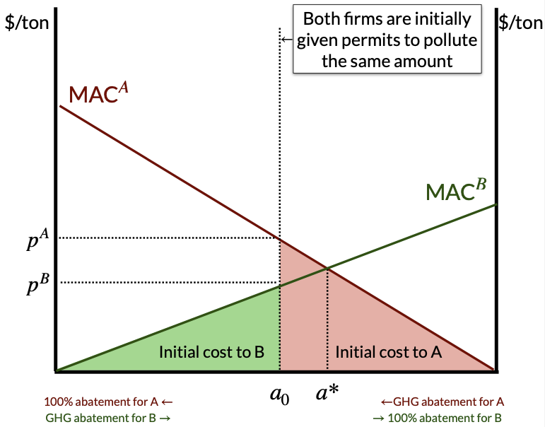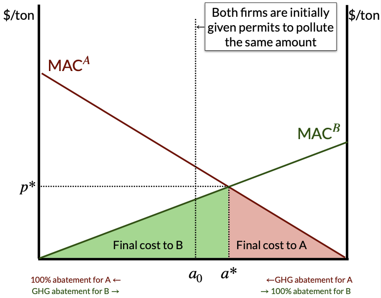 In Figure 3, imagine that the regulator freely allocates an equal number of permits to each firm (represented by point \(a_0\)). At this level of abatement, firm B has MAC = \(p^B\) and firm A has MAC = \(p^A\), where \(p^A > p^B\). Because the marginal cost of abating one more ton of GHGs is cheaper for firm B than it is for firm A, firm A should be willing to purchase a permit from firm B rather than abating their last unit of GHGs. Once this transaction occurs, then the process repeats itself until the marginal cost of abatement is equalized across firms. The firms will trade until they reach point \(a^\star\), which is the socially optimal level of abatement. The price of permits is equal to the marginal cost of abatement for both firms. Notably, the equilibrium permit price is identical to the carbon tax that would achieve the same level of abatement. The cost of acheiving the emissions reductions is minimized, just like with a carbon tax.
