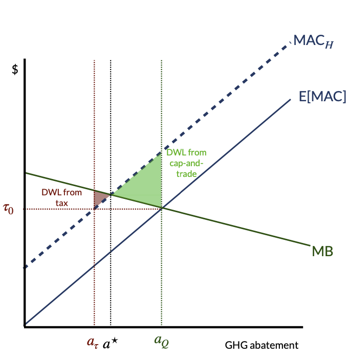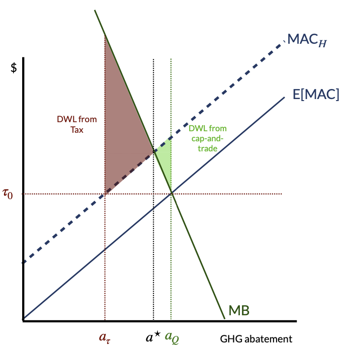 Similarly, still focusing on the left-hand side of Figure 4, imagine the regulator also wants to set a tax based on E[MAC]. They choose a tax \(\tau_0\), which generates too little abatement. Without uncertainty, the regulator would have set the tax at the intersection of the MAC\(_H\) curve and the MB curve. But, because they have imperfect information, they set the tax too low, resulting in too little abatement. This results in a DWL that is the area of the shaded red triangle.