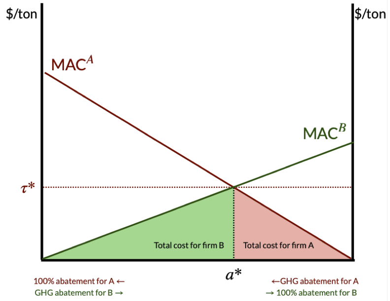 Taxes can achieve emissions reductions at a lower cost than alternative policies. To see this, consider two firms (A and B) facing a GHG price \(\tau^\star\) in Figure 2. In this figure, the width of the horizontal axis is fixed at the total level of emissions reductions needed in the the market (comprised of only the two firms). So, if we operate all the way on the left, then firm A produces all of the GHG abatement. If we operate all the way on the right, then firm B produces all of the GHG abatement. If we operate somewhere in the middle, then both firms produce some level of the required GHG abatement. When a tax on GHG emissions is set, each firm is going to abate GHG emissions up to the point where the tax equals their MAC curve.
